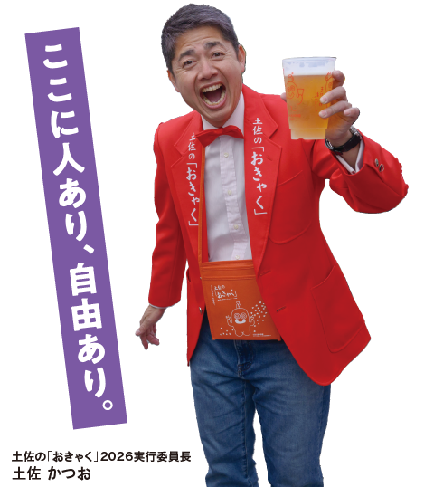 ![]() 実行委員長に就任して3年目を迎えました、土佐かつおでございます! 「おきゃく」をこよなく愛する一人として、今年もこの大役を任せていただける喜びをかみしめております。 3年目、さらに気合を入れて、高知の街をこれまで以上にあつく盛り上げていきたいと思っております! 僕の中で土佐の「おきゃく」は、笑顔があふれ、高知らしさが全開になる最高のイベントです。老若男女、県内・県外を問わず、集まった人たちがまるで家族のように繋がっていく。そんな不思議で温かい力が、この土佐の「おきゃく」にはあります。 今年はついに19回目の開催。来年大きな節目である「20周年」を目前に控え、今年はそこへ向けて一気に加速していく大切な年です。みなさんと一緒に、「これぞ高知!」という最高の景色を作れることが楽しみで仕方がありません。 さあ、皆さま!楽しすぎて、飲み過ぎに注意! 開催期間中、街の至る所でみなさんの笑顔あふれる「乾杯!」を心待ちにしております! |